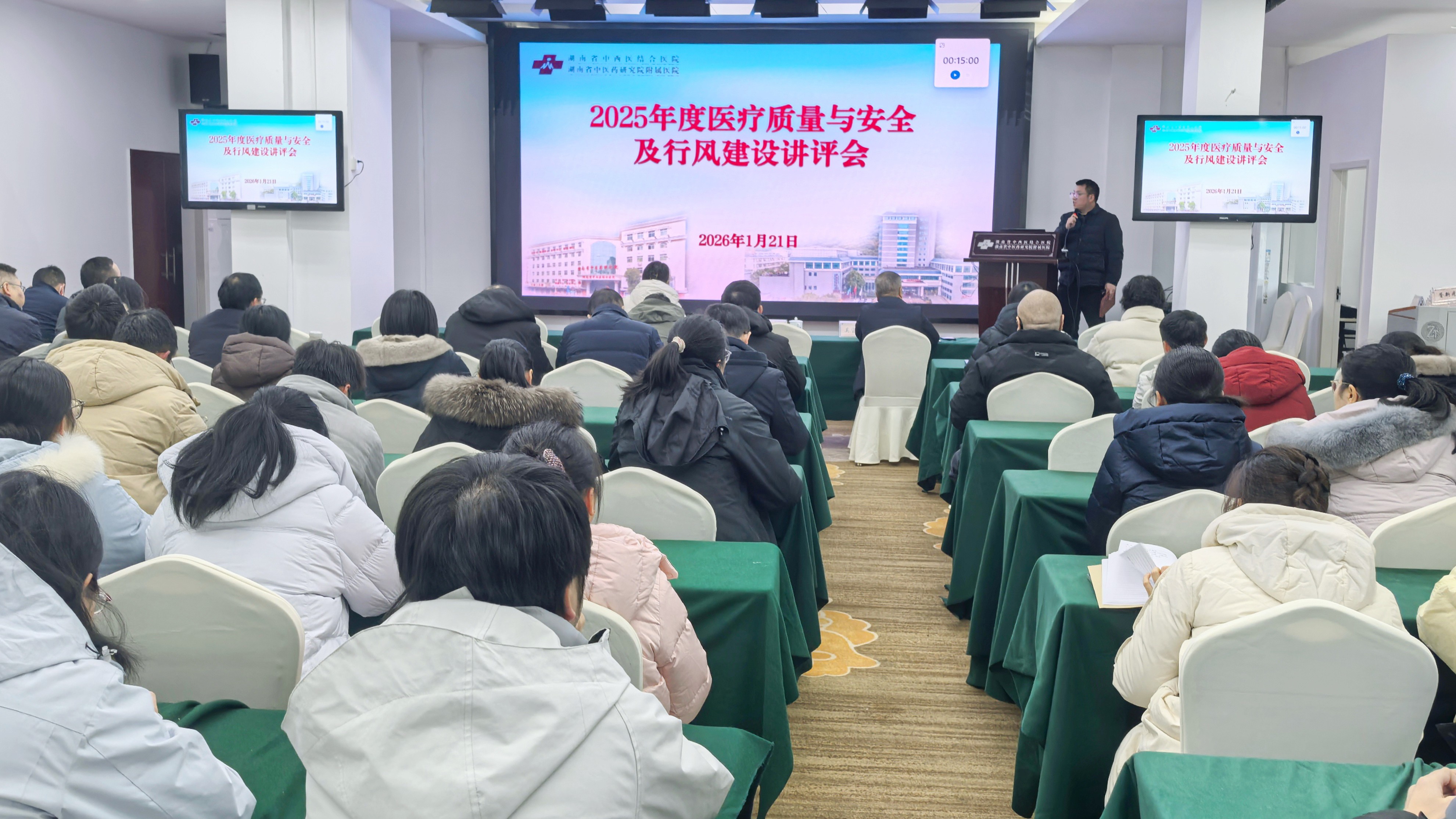 1月21日,湖南省中西医结合医院在内科楼五楼多功能厅组织召开了2025年度医疗质量与安全及行风建设讲评会。党委委员、常务副院长伍大华,党委委员、副院长吴官保出席会议并讲话。全院临床医技科室主任(负责人)、副主任及当日非值班医技人员参加会议。