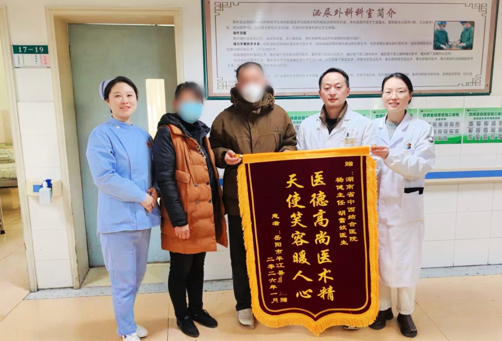 1月23日,52岁的患者彭先生将一面写有“医德高尚医术精,天使笑容暖人心”的锦旗,送到湖南省中西医结合医院泌尿外科杨健主任与胡雪姣医生手中,感谢科室团队以精湛技术和细致服务帮助其恢复健康。