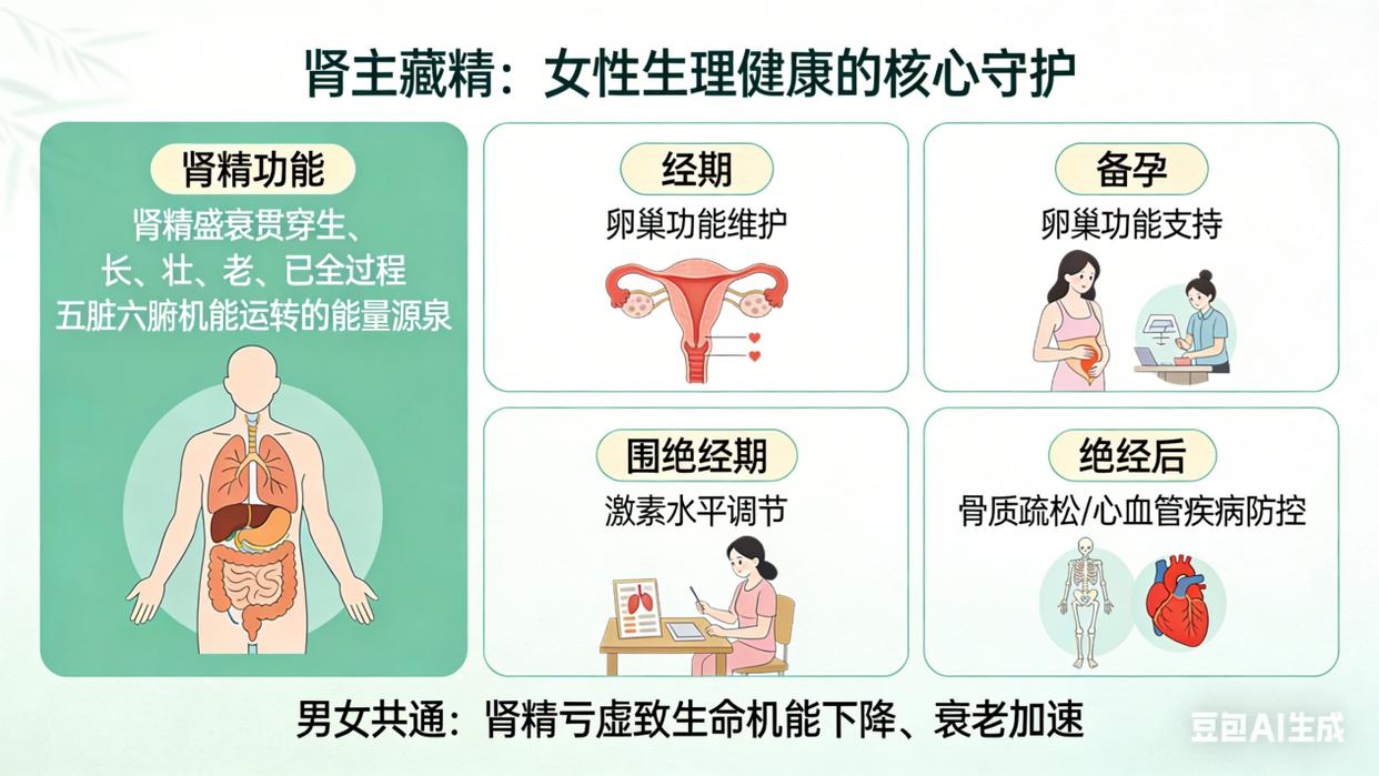 中医经典明确提出“肾主藏精”,肾精的盛衰贯穿人体生、长、壮、老、已的全过程,是五脏六腑机能运转的能量源泉,无论男女,肾精亏虚都会导致全身生命机能下降,衰老便由此开始。对于女性而言,肾精更是守护生理健康的核心,从经期、备孕的卵巢功能维护,到围绝经期的激素水平调节,再到绝经后骨质疏松、心血管疾病的防控,都离不开肾精的充养。