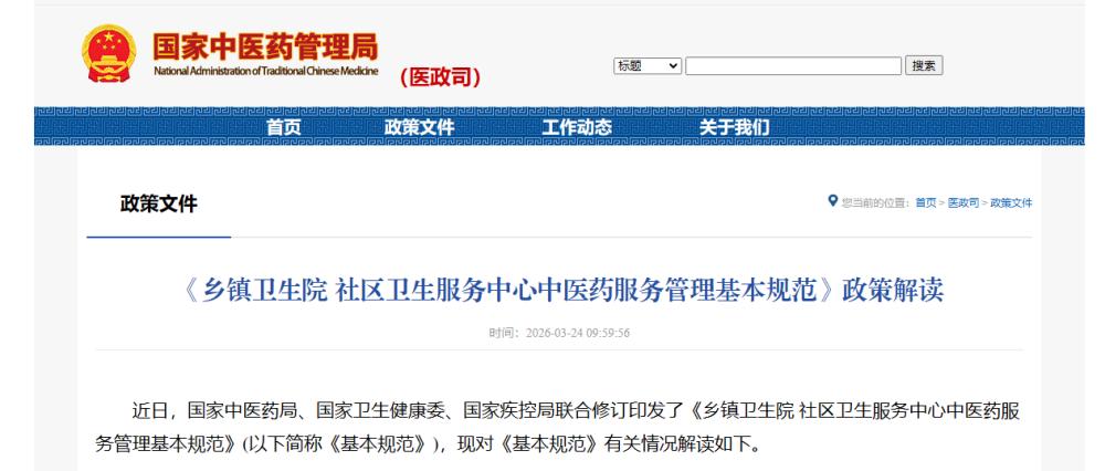 近日,国家中医药局、国家卫生健康委、国家疾控局联合修订印发了《乡镇卫生院 社区卫生服务中心中医药服务管理基本规范》(以下简称《基本规范》),现对《基本规范》有关情况解读如下。