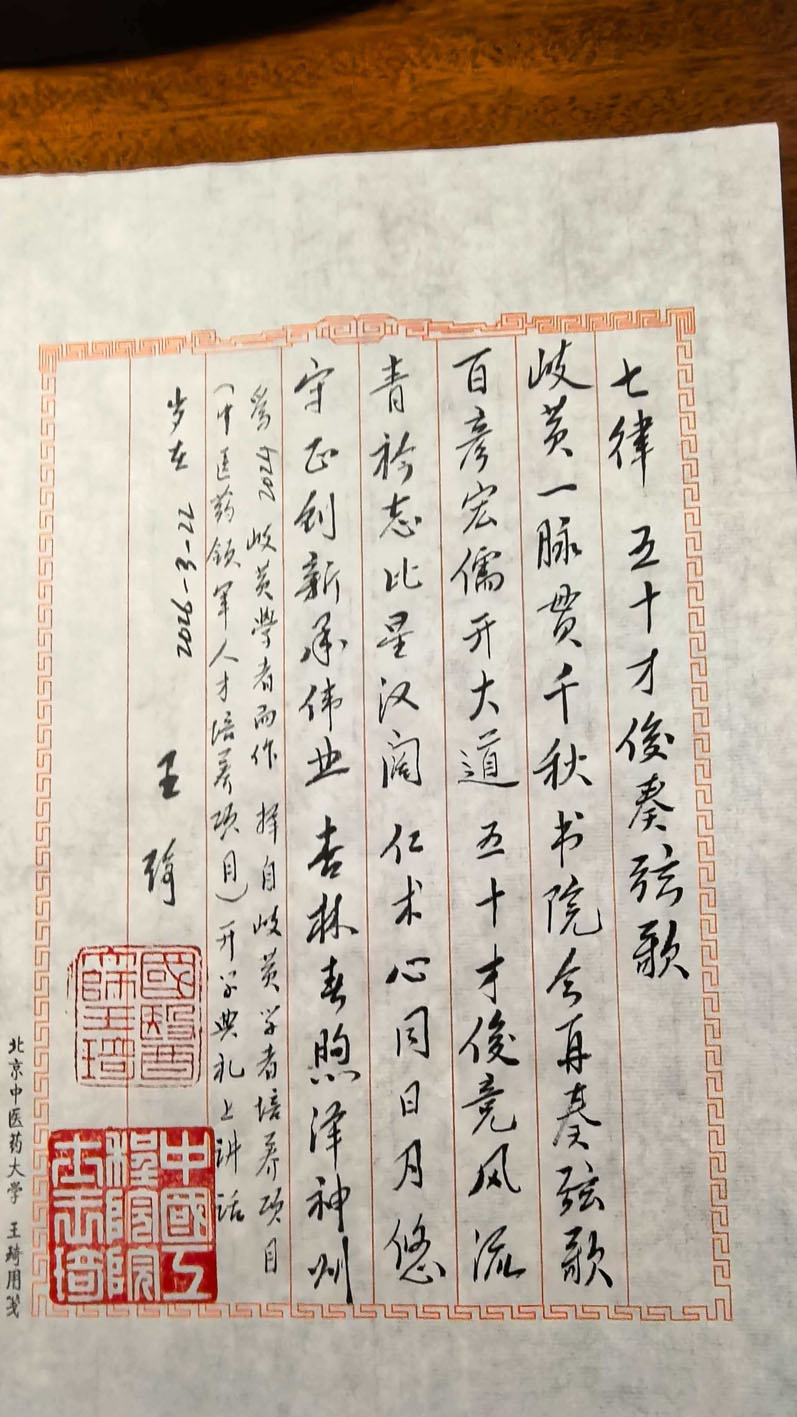 近日,在岐黄学者培养项目(中医药领军人才培养项目)开班仪式现场,国医大师、北京中医药大学终身教授王琦以诗作寄语岐黄学者培养项目,助力中医药人才发展。受访者供图