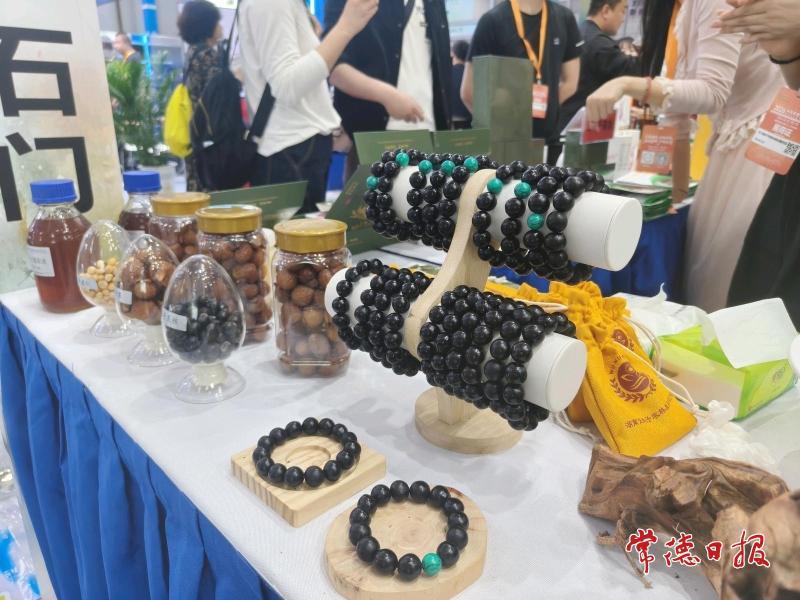 石门展区主推无患子系列产品,无患子手串、面膜、洗发水、香皂等产品引人注目。湖南无患子农林发展有限公司董事长盛克寨介绍,通过“公司+基地+合作社+农户”模式,该公司自建基地3万亩,带动全县种植12万亩,不仅让石漠化荒山变“绿色银行”,还解决全县100多名残疾人员就业。