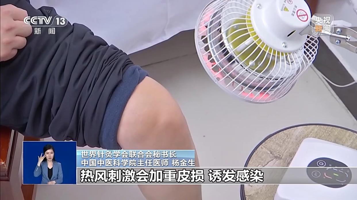 中国中医科学院针灸医院主任医师 王莹莹:如果热风的温度高、风力强,吹的时候距离太近或者时间过长,非常容易造成局部烫伤。还有一些特殊人群,尤其是老年人和儿童的皮肤娇嫩、脆弱,这些人群要格外注意。有基础疾病的患者,像中风后肢体瘫痪或者神经损伤导致肢体麻木,还有一些长期糖尿病导致外周神经感觉障碍的患者,这些人群非常需要谨慎操作。局部有严重的疖肿感染或皮肤溃烂等,这些部位是要禁止直接热吹。