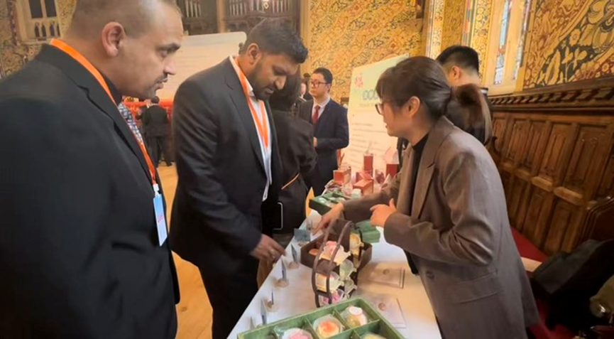 南京中医药大学带来的则是中医药文化和江苏非遗的碰撞。该校党委宣传部副部长刘丹青介绍,这次带来的金陵非遗药膳茶点灵感来自药食同源的中国饮食文化,印刷体验也是将中医药经典古籍和来自扬州的国家级非物质文化遗产雕版印刷技艺做了结合。“希望大家能在浓浓中国味道、书香气息中感受到中医药文化‘融入生命生活’的独特魅力。”曼彻斯特议员Naila Sharif 亲手制作了中医养生学专著《尊生要旨》中的“八段锦导引图”书叶,“太美了,这简直是Art(艺术)!”,她连连称赞并表示要带回家中珍藏。